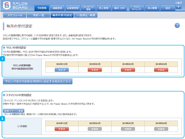 基本設定を元に毎月1日に翌月以降の「未設定」を「設定済」へ自動延長する便利機能です!イレギュラーでサロンの休みが変更になる場合や、スタイリストごとの休みが変わる場合もあるので、確認は必ず行ってください。